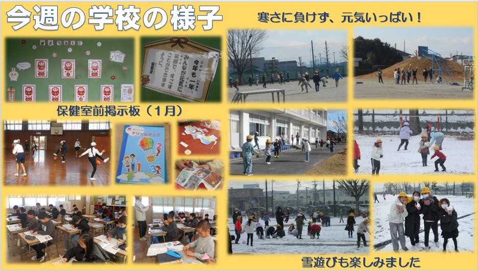 後期の後半が始まって4日経ちました。今週は、雪が降る寒い日もありましたが、子どもたちは元気いっぱいです。授業では集中して学習し、休み時間の運動場は多くの子どもたちが思いっきり体を動かしています。(今日は雪遊びもありました)来週も寒い日が続くそうです。体調管理をしっかりして、来週も元気にがんばりましょう。