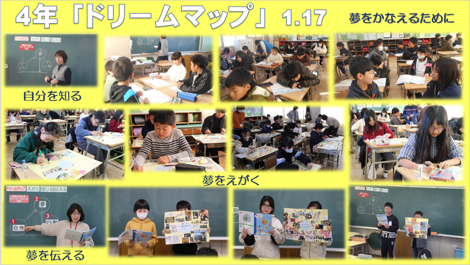 1日(6時間)かけて、自分の夢(未来)について学習します。午前中は自分を知り、自分の夢と向き合い、ドリームマップを作成しました。午後は自分の夢を皆に伝え、振り返りをしました。〇年後にどんな姿になっているのかを自由に想像し、友達の夢も素直に受け入れ、楽しく学習することができました。