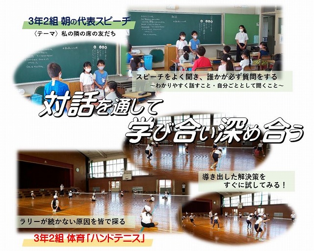 『対話』をとおして子どもたちを成長させていこうと取り組んでいます。その土台固めとして、子どもたち一人一人が、人の話をよく聞き、その考えのよさに気付き、称賛したり問題点について言及したりできる「深まり」のある会話、つまり