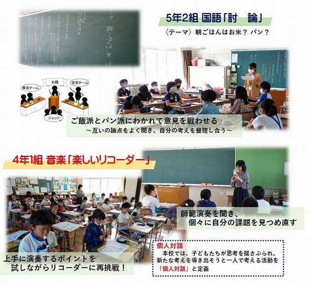 対話」をうまくつないでやることで、互いに深め合い高め合うよう仕向けけています。マスクの着用だけでなく、飛沫の拡散防止の意識を子どもたちにもたせながら学習に取り組ませていますが、少しずつではありますが、着実に成長へと導いています。
