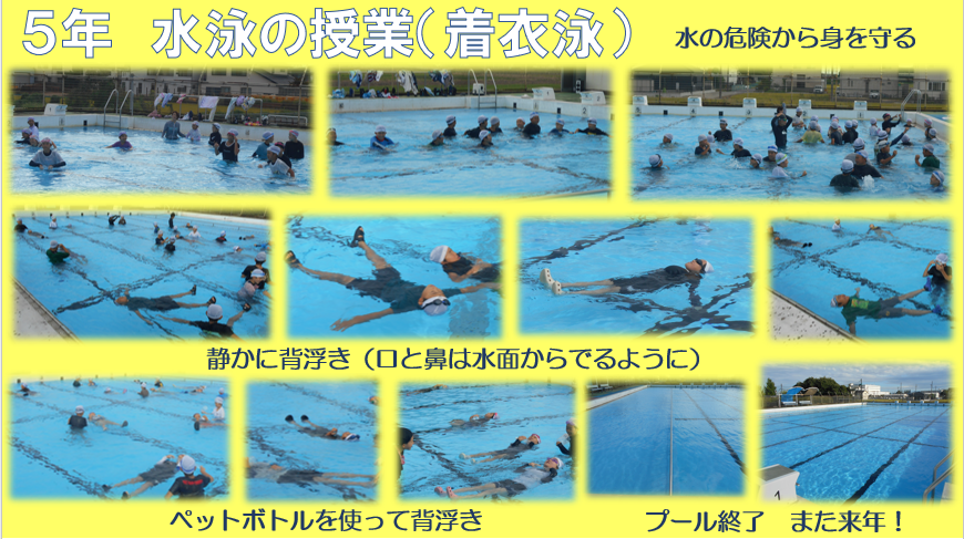 先週の金曜日、5・6時間目に5年生が、水泳の授業で着衣泳を行いました。水の事故から身を守るために何ができるか体験しました。「無理に泳がず静かに浮いて流されながら助けを待つ」「自分では助けに行かず、大人を呼ぶ」「浮くための道具があれば、投げて使ってもらう」など、もしものときの行動を学びました。