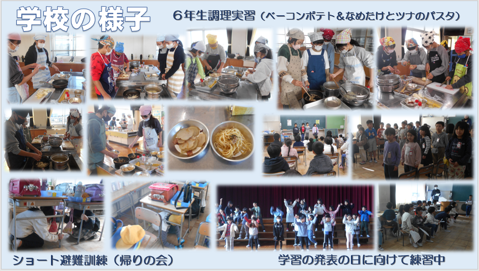 昨日と今日、6年生が調理実習を行いました。役割分担をしながらていねいに調理し、おかずと主食を作りました。調理するだけでなく後片付けも同時進行でできていてすばらしいと思いました。