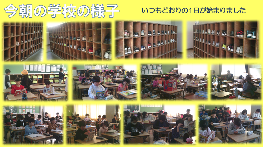 今朝の学校の様子です。朝の準備(荷物の片づけ・宿題の提出・連絡帳の記入・読書など)がいつもどおりに進んでいきます。朝の会もしっかり行い、落ち着いて1時間目の学習に取り組むことができていますね。