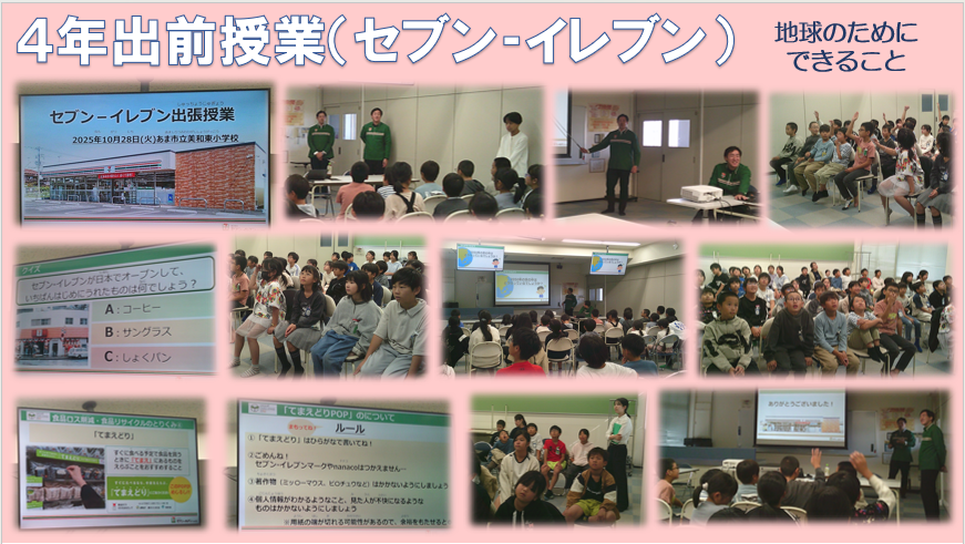 今日の5時間目に、4年生の出前授業がありました。セブン-イレブンの方による、環境への取組のお話でした。クイズに答えたり、リサイクルの動画を見たりして、地球温暖化を進行させないための取組について学習しました。