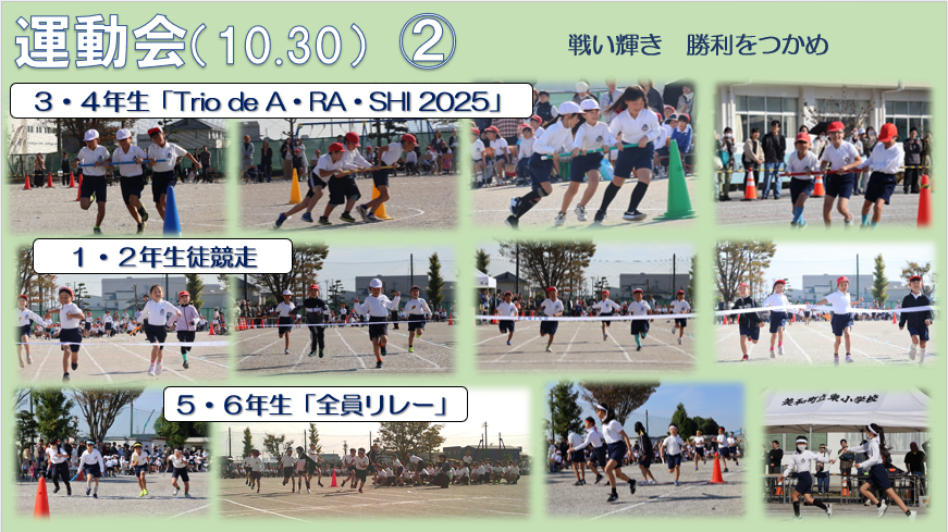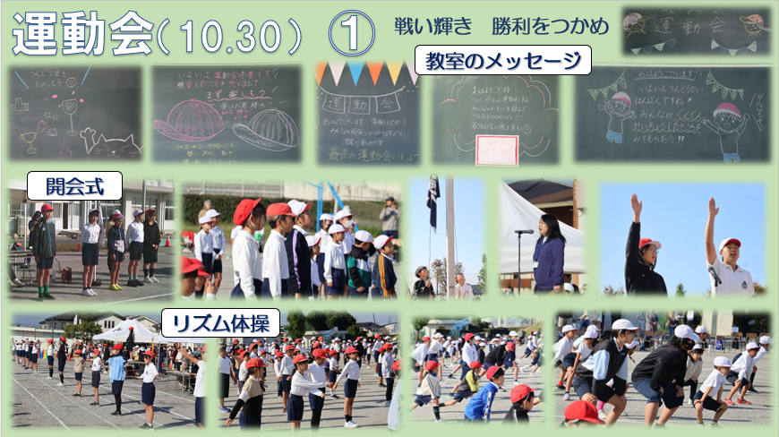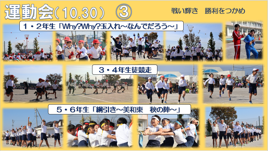 今日は、晴天に恵まれ、絶好の運動会日和でした。運動会テーマ「戦い輝き 勝利をつかめ」のもと、全員が一生懸命がんばりました。(今日は半分の掲載です。明日も運動会の様子をお伝えします。)