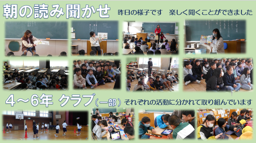 昨日の朝は、読み聞かせがありました。楽しいお話を集中して聞くことができました。いつもありがとうございます。