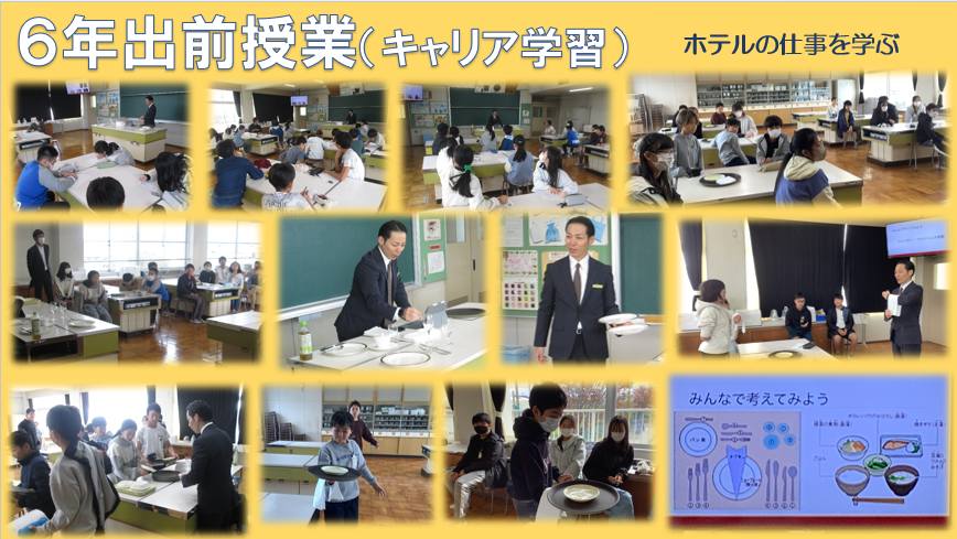 12日(水)の3・4時間目に、6年生の出前授業がありました。名鉄グランドホテルの方にお越しいただき、接客業について学習しました。ひとつのホテルにさまざまな部署があることを教えていただき、「ウエイター・ウエイトレス」として、スープに見立てた水の入ったお皿を姿勢よく運ぶ体験をしました。笑顔で運ぶことができていましたね。