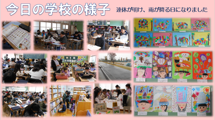 体調を崩して欠席する児童が増えてきています。基本的な感染症対策(手洗い・うがい・早寝早起き・朝ごはん・適度な運動・定期的な換気)はもちろんですが、体調が悪いときは無理をせずゆっくり休養してくださいね。