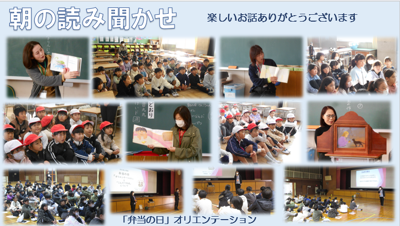 今日の朝は読み聞かせでした。今日のお話もいろいろなジャンルでたいへんおもしろく聞くことができました。ありがとうございました。