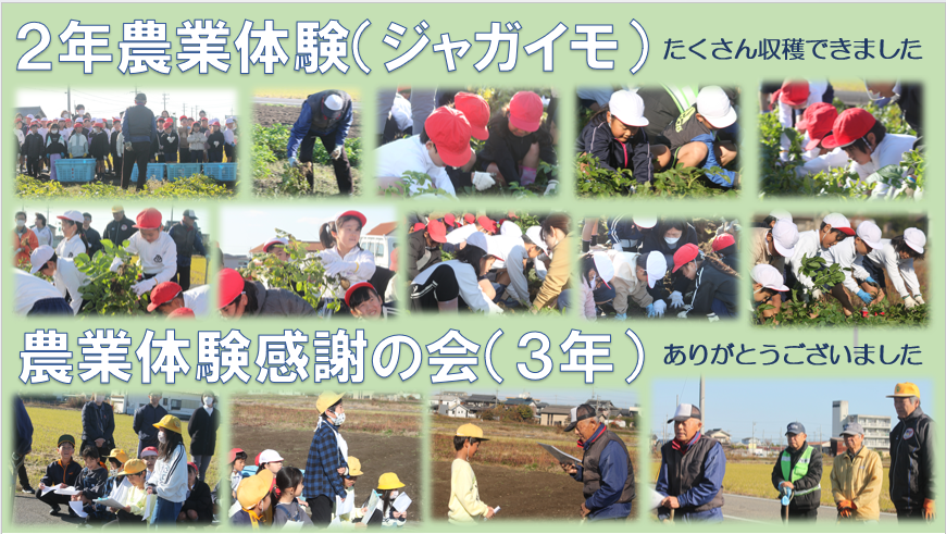 昨日の1時間目に、2年生が農業体験でジャガイモを収穫しました。まず、茎を引っ張って収穫し、その後、土の中にあるジャガイモを掘り返して見つけました。さまざまな大きさのジャガイモが収穫できました。持ち帰ったジャガイモをおいしく調理して食べてくださいね。