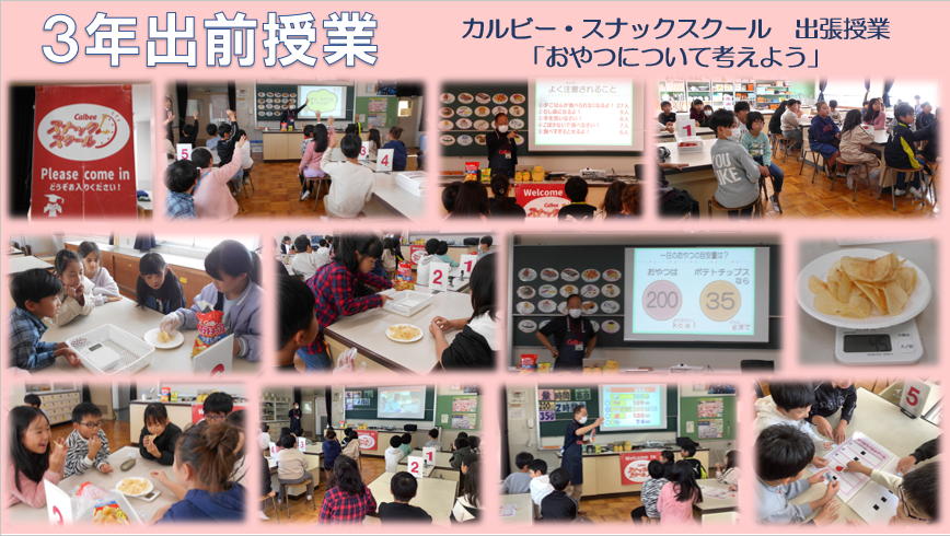 先週の金曜日の3・4時間目に、3年生の出前授業がありました。カルビー様にお越しいただき、おやつについて考えました。成長するために食事は欠かせず、3食(朝・昼・夕)しっかりバランスよく食べること、おやつは3食を補うためのものであること、もしおやつを食べすぎたら、しっかり運動や勉強をし、次の日のおやつの量で調整すればよいことを教えていただきました。おやつの適切な量を知ることができましたね。