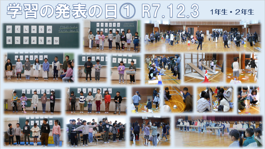 今日は、学習の発表の日でした。お忙しいところ、たくさんの保護者に来ていただきました。ありがとうございました。それぞれの学年に応じて、今まで学習してきたことを発表しました。まずは、1・2年生の様子をお知らせします。元気よくがんばりましたね。