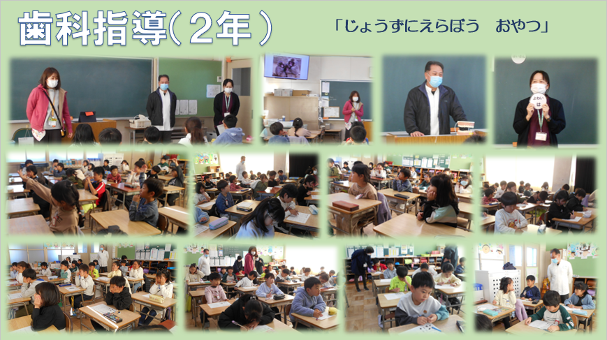 今日の3・4時間目に2年生の歯科指導がありました。前歯と奥歯の役割や虫歯予防のためのおやつの食べ方、歯みがき前にチェックすることなどを教えていただきました。やわらかい物ばかりではなく、硬い物をしっかりよくかんで食べることで、あごの筋肉を鍛え、あごが広がり歯並びがよくなるそうです。また、お菓子やジュース、スポーツドリンクには砂糖がたくさんあるので、食べ方を工夫することが大切だと知ることができました。