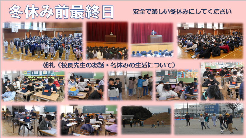 今日で、令和7年度後期の前半が終わりました。9月から12月まで学年行事や学校行事があって、みなさんのがんばりと成長をたくさん見ることができました。