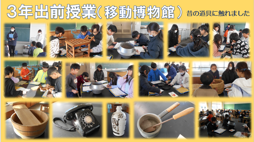 今日の2時間目に、あま市美和歴史民俗資料館の方に来ていただき、移動博物館を行いました。昔使用していたさまざまな道具に触って、どのように使われていたのかを学習しました。今では見かけない道具ばかりで、どうやって使うのか全く分からない道具もありました。