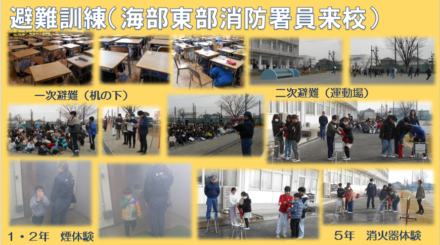 今日の1時間目に、海部東部消防署の方に来ていただき避難訓練を行いました。余震が何回か起き机の下にもぐる一時避難と、地震により火災が発生したことによる運動場への二次避難を行いました。放送や先生の指示を聞いて、安全に避難できていました。
