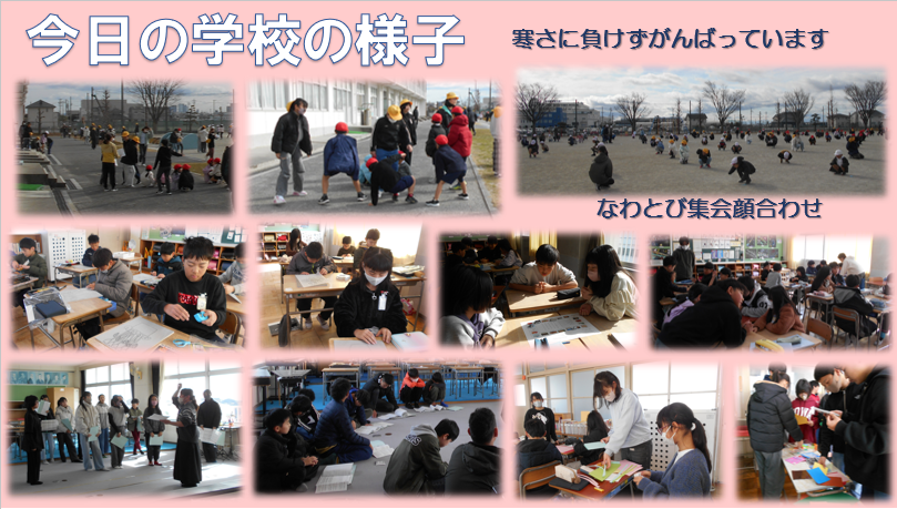今日の学校の様子です。2時間目の休み時間には、22日から始まる「なわとび集会」に向けての顔合わせ会(場所確認)でした。異学年交流のチームに分かれてなわとびをします。寒い中ですが、体力づくりのためにがんばりましょう。
