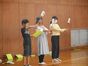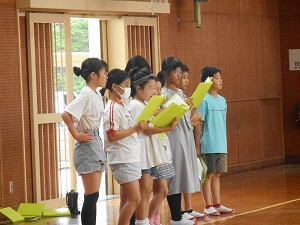 体育館から「遠き山に日は落ちて」「キャンプだホイ」などキャンプソングを歌う元気の良い声が聞こえてきました。5年生が、輪になってキャンプファイヤーの練習をしていました。実行委員の子ども達が進行をつとめ、スムーズに進行していました。本番のように、トーチ棒を使って「誓いの言葉」の練習もしました。野外活動では、それぞれの役割を果たし自信をもって活動できること、みんなで力を合わせて一つのことを成功する喜びが味わえること、共通の楽しい思い出ができることを願っています。