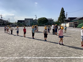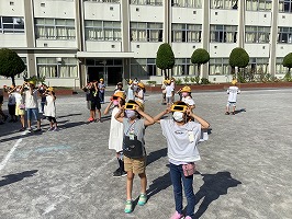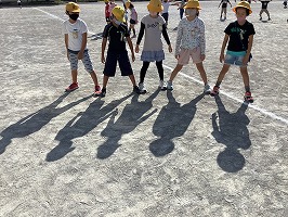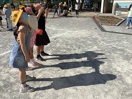 秋晴れの中、外で観察をしていると、子どもたちから「先生、かげおくりしていい?」との声。国語科で「ちいちゃんのかげおくり」の学習をしているので、かげおくりに興味をもったようです。「かげおくり、はじめてやるよ」「みんなでやってみようよ!」と、声をそろえて数えたり、ポーズを作ったりしながら、楽しそうに空に大きなかげを送っていました。