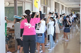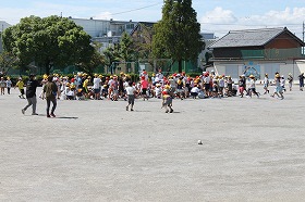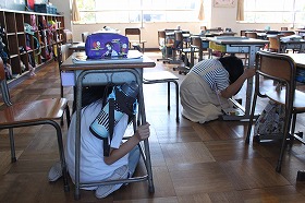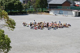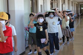 今回の避難訓練は、2時間目の休み時間中に行いました。火災をともなう地震発生時の安全な行動を知らせ、安全に避難できる態度や能力を養い、沈着・冷静にその場に応じた適切な行動をとるためのものです。児童も職員も、真剣な面持ちで『お・は・し・も』を守って避難することができました。