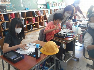 6年生の国語では、目的や条件に応じて話し合うことをねらいに学習しています。今回は、「1年生とみんなで楽しく過ごすためにどうしたらよいだろう 」というテーマで話し合い、グループごとに1年生に喜んでもらえるような遊びを考えました。転がしドッジや空気砲、動く的あてゲームなど、工夫をこらした遊び道具がたくさん並びました。説明する時にしゃがんで説明したり、的に命中したら「すごい」とほめてあげたりと、1年生のことを考えて進めているのを見て、「さすが6年生だな」と感心しました。今日は、6年生と1年生の1組が交流しましたが、6年2組と1年2組は水曜日に交流する予定です。