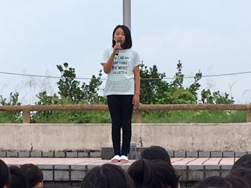 朝のつどいでは、代表児童が篠田小学校の紹介をしました。