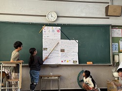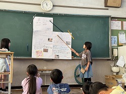 10月17日(木)に、スーパーマーケットの取組や工夫について、グループ発表を行いました。『肉』『魚』『野菜』『くだもの』班に分かれて、店内の工夫や売場の工夫、店長さんから聞いたことについて発表をしました。子どもたちは緊張しながらも、堂々と発表することができました。