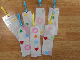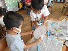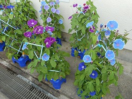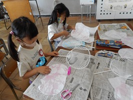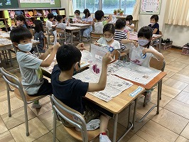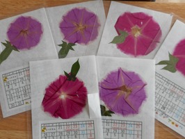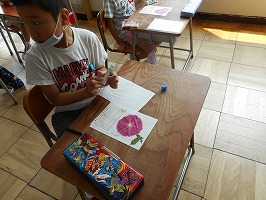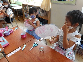 今年はアサガオがたくさん咲きました。5、6個の花を使って色水を作り、その色水を使って紙を染め、うちわとしおりを作りました。また、朝に咲いた花を押し花にして、夏休みカレンダーを作りました。部屋に夏休みカレンダーを飾って、暑い日にはうちわで涼んでみてください。読書の際には、ぜひ手作りのしおりを作ってみて下さい。