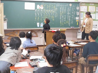 絵手紙の先生をお招きして、5年生が絵手紙をかくことに挑戦しました。絵手紙専用の薄墨を少しずつ分けていただいて、筆の上の方を持ち、筆を立ててスーッと横線や縦線を引く練習から始めました。練習の後、いよいよはがきに書きます。りんごやみかん、稲穂など目の前にあるものを描きます。輪郭が書けたら、絵の具で彩色します。色はタッタッタッタッと点を打つようにのせていきます。それぞれの良さが光る味わい深い絵手紙となりました。