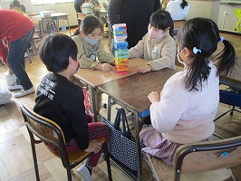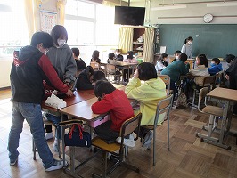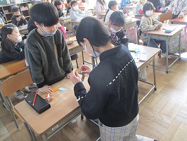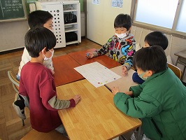 2年生は、1年生に生活の学習で作ったおもちゃで遊んでもらう「おもちゃランド」の準備を進めていました。魚つりのチームは、お客さんの1年生役とお店屋さん役の2年生と分かれて、ルール説明や遊び方の確認をしていました。「時間を短く30秒ぐらいにした方がいいかな」「ひもの長い釣り竿でも大丈夫かやってみよう」など、実際にやってみて改善していたところがすばらしいと感心しました。やってみたらやぶれてしまったから修理したり、こわれた時のために予備を作ったりしているチームもありました。皆で協力して1年生が喜んでくれるようがんばっているので、1年生にとっても2年生にとっても楽しい会になるよう願っています。