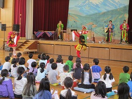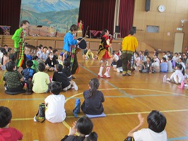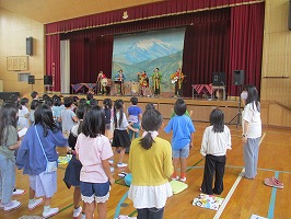 温かで、どこかなつかしい音色に耳を傾けていると、今度はアップテンポのお祭り音楽。自然と手拍子が起こり、体を揺らしながら楽しむことができました。最後は、音楽に合わせて、手拍子、足ぶみ、ジャンプ。体育館に響き渡る素敵な音楽と子どもたちの笑顔・・・とても素晴らしい鑑賞会になりました。