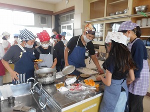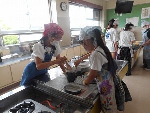5年生は、6月11日(水)12日(木)の野外活動に向けて着々と準備を進めています。今日は野外炊飯の練習で、飯ごうでご飯をたき、カレーライスを作っていました。自分たちで作ることができるように、係ごとの手順書を見て次に何をすればよいか考えて行動していました。炊き上がった飯ごうを慎重にひっくり返し、新聞紙でこすったり、野菜に火が通っているか箸でさして確かめたり、カレーを入れてルーをとかして「もういいかな」とみんなで相談したり・・・と協力して進めていました。本番はかまどに火をおこして炊くので大変ですが、今日の経験をいかし力を合わせておいしいカレーを作ることができると思います。