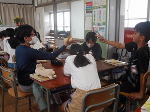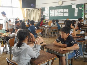 5時間目に全校でスマイルトークを行いました。質問じゃんけんの2回目です。じゃんけんをして勝った人が、好きな食べ物、行きたい国、好きなくだものなどテーマの中から一つ選んで質問をするのですが、じゃんけんをするだけでもとても楽しそうなのが印象的でした。あいさつをする、目を見て話す、うなずく、先生の指示を聞くという約束を守ってできたことを先生にほめてもらったり、友達が自分の話を聞いてくれてうれしかったりと、温かな雰囲気で行うことができました。