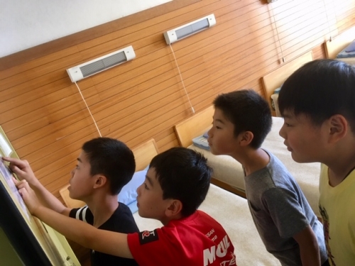 2年生の算数では、持ち寄った空き箱を使って「はこの形」の面や辺、頂点について学習していました。面の数、辺の数、頂点の数を重複して数えてしまわないように、面に貼り付けた画用紙に印をつけながら数えていました。印をつけることで正確に数えることができました。その後、辺の長さにも着目して長さが同じ辺が4本ずつであることも確かめました。