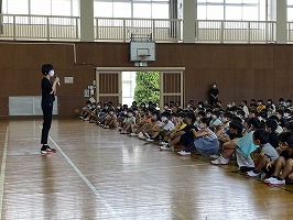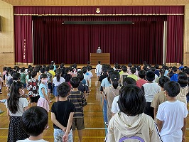 運動会の総練習を行いました。開閉会式は児童会役員が練習の成果を発揮してスムーズに行うことができました。どんな器具をいつ出して片付けるのか、放送のタイミングや声の大きさは良いかなど、それぞれの委員会の仕事を確認しました。低学年の「ダンシング玉入れ」や綱引き、紅白リレーなど、実際に競技をした時には、本番さながらの応援で勝敗の行方を見守りました。