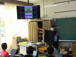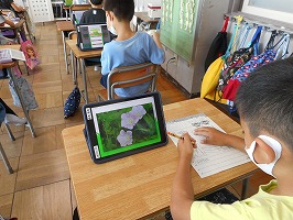 生活科の「なつとなかよし」の学習で、タブレットPCを使って夏の生き物を調べました。タブレットPCを使う初めての学習だったので、最初にタブレットの扱い方やきまりをみんなで確認をしました。その後、生き物図かんのサイトを使って自分の好きな昆虫や植物を調べて絵や文にかきました。初めてのタブレットPCに、ドキドキしながらも楽しく学習を進めることができました。