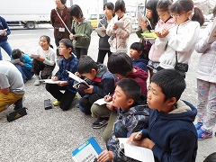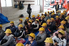 施設見学では、はしご車、救急車、タンク車、救助工作車など様々な車の見学をしました。消防車それぞれに役割があるということを学び、しっかりとメモをとっている姿が見られました。
