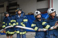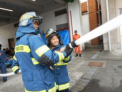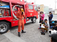 消防体験では、実際の服を着て、放水体験を行いました。子どもたちからは、「思ったよりも服やホースが重い!」「すごい勢いで水が出ました!」などの感想を聞くことができました。