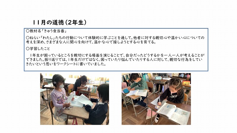 待ちに待ったおもちゃランドを開催しました。2年生は、朝から1年生を迎える準備をしていました。ゴムや磁石、空気の力を利用した手作りのおもちゃのお店がたくさん並びました。2年生は、遊び方やルールを説明し、お手本を見せたり、商品をあげて次の人に交代させたりと、1年生が楽しく遊べるようにがんばっていました。1年生は、2年生に優しくしてもらい、友達と楽しく遊び、メダルや折り紙の景品をもらって大喜びでした。この経験を通して、ともに成長の機会につなげていきたいと思います。