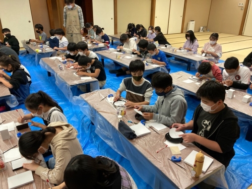 宿舎に着いてすぐに体験活動になります。学校で選んだデザインで絵付け体験をします。