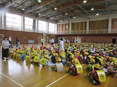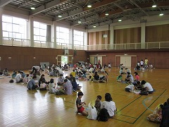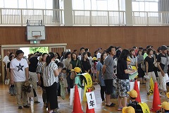 その後、引き渡し訓練を行いました。あま市近隣市町村に震度6の地震が発生したと想定し、訓練を行いました。校内放送を聞き、担任の先生の指示に従い、実際に地震が起こった場合、どのように行動したらよいかを考え、体育館へ避難しました。