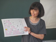 最初に、2種類の迷路に取り組ませた後、迷路の作り方の説明を聞きました。決められた動きを提示し、ゴールできる迷路を考えました。自分が作った迷路をグループの友達や全体の前で発表しました。