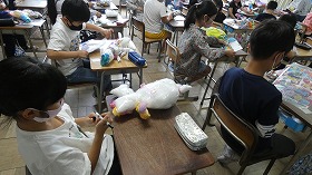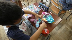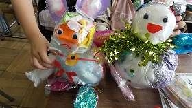 透明な袋の中に用意した材料を詰め、ふわふわでカラフルな作品になるようにとイメージを膨らませながら作品を作ります。モールで袋をしぼったり、袋と袋をくっつけたり・・・ぱっちり目を付けて、自分だけの友達ができました!