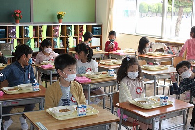 今日のメニューは、「カレーライス(むぎごはん)」「ささみフライ」「ツナサラダ」「牛乳」でした。給食当番さんが上手に配膳し、エプロンをたたんで「いただきます」をしました。