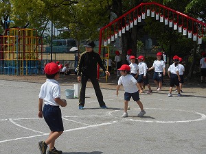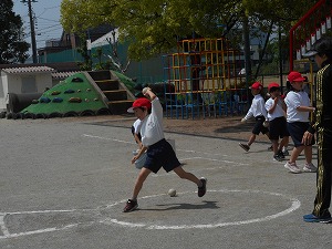 今日から、体育の時間を利用して体力テストを行っています。2時間目には、1年生がソフトボール投げの記録を測定していました。投げる手と反対の手を前に出して、足も一歩踏み出し、前に向かって投げました。1回目ファウルになってしまっても、2回チャンスはあるので、今度はファウルにならないように気をつけて、まっすぐ斜め上に向かって投げていました。順番が次の子は、ボールを用意して、線の後ろに並ぶことや、ボールを拾うときは、先生より後ろでボールをひろって、箱とバケツにボールをもどすことなど、安全に行うためのお約束を守り、スムーズに記録を測ることができました。