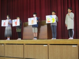 児童会から運動会テーマの発表が発表されました。テーマは「輝く絆 限界突破!」です。みんなで応援し合いながら、自分の目標に向かって頑張る姿が楽しみです。