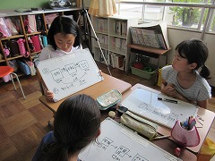 一人で考える場面では、ホワイトボードを使い、関係図を用いて式を立てました。一人で考えた後、グループの友達に、自分の考えを自分の言葉で説明しました。