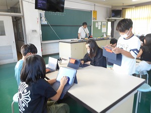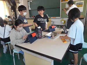 植物が発芽して成長するには、水が必要であるとともに栄養も必要であるけれど、それはどこにあるのかを調べる実験をしました。種を切って皮をとり、すりつぶしてヨウ素液にひたすと青紫に色が変わり、でんぷんが含まれていることがわかりました。同じように発芽してしばらくたった子葉をつぶしてヨウ素液をかけても色は変わりませんでした。実験の結果を写真に撮り、ロイロノートでまとめをしました。