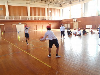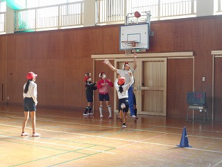 5年生の体育では、バスケットボールをしていました。はじめに、縄跳びをして体を動かし温めました。次に、手からボールが離れないように気をつけながら、ボール慣らしの運動をしました。それから、4人組で、チェストパス・バウンズパス・オーバーハンドパスを5周ずつ右回り・左回りとテンポよく行い、早く終わった班からシュート練習をしました。最後に、斜めに三角に分割した4つの三角バスケットコートで、攻めと守りを交代しながら、試合形式でパスをつなぐ練習をしました。見本を見て、どんな練習をするのか全員がわかって練習していたことやチームごとに声をかけ合って自分たちで練習を進めていたことがとても良かったです。
