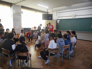 全校縦割り班活動で青空集会を行いました。今日は、縦割り班のメンバーが仲良くなれるように6年生が考えてきた遊びを楽しみました。いすとりゲームや絵しりとり、サイコロ自己紹介、シルエットクイズなどなど、それそれの班の6年生がいろいろな遊びを考え、タブレットでクイズの問題と答えをうつしたり、手作りサイコロを用意したりと工夫して準備してくれました。6年生のがんばりのおかげで全校が楽しい時間を過ごすことができました。